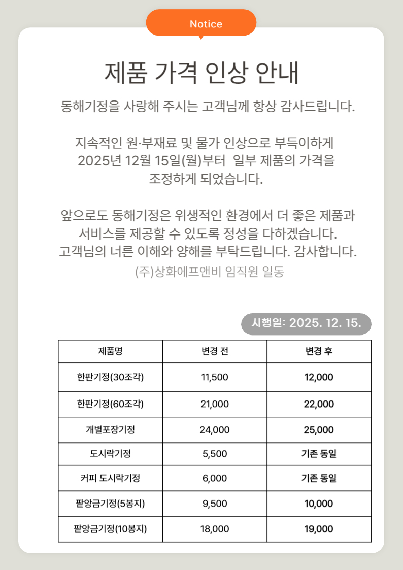 제품 가격 인상 안내